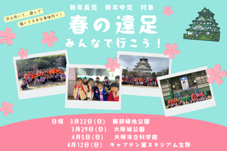3/22(日) 服部緑地公園 公園で先生やお友達といっぱい遊ぼう! 3/29(日) 大阪城公園 きれ … 続きを読む 2026年度 春の遠足